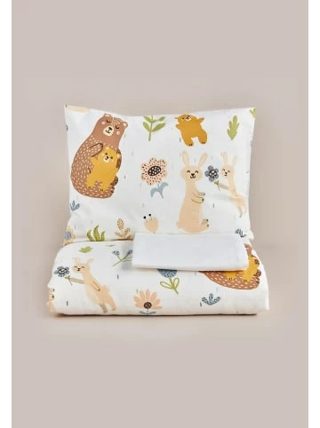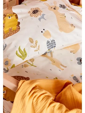 Die Babykollektion der Marke Bella Maison besticht durch den reinen Baumwollanteil und die farbneutralen Designs. Das bedruckte Bettwäscheset für Babys ist ein Blickfang für Ihr Babyzimmer dank des niedlichen Allover-Musters. Das Set besteht aus drei Teilen: Kissen- (35 x 45 cm) und Bettdeckenbezug (100 x 150 cm) sowie ein Spannbettlaken (80 x 140 cm). Die Baumwollbettwäsche in 57 Fadenzahl/cm2 bietet mit ihrer Ranforce-Qualität einen weichen Griff. Die Feinheit der Fasern macht dieses Set hautfreundlich und komfortabel. Kopfkissenbezug und Bettbezug sind mit Knopfverschluss ausgestattet. – Niedliches Bettwäsche-Set der Marke Bella Maison – Aus reiner Baumwolle gefertigt – angenehm weich – Besteht aus 3 Teilen: Bettdecken-, Kissenbezug & Bettlaken – Mit süßem Allover-Print – Maschinenwaschbar bis zu 30°C